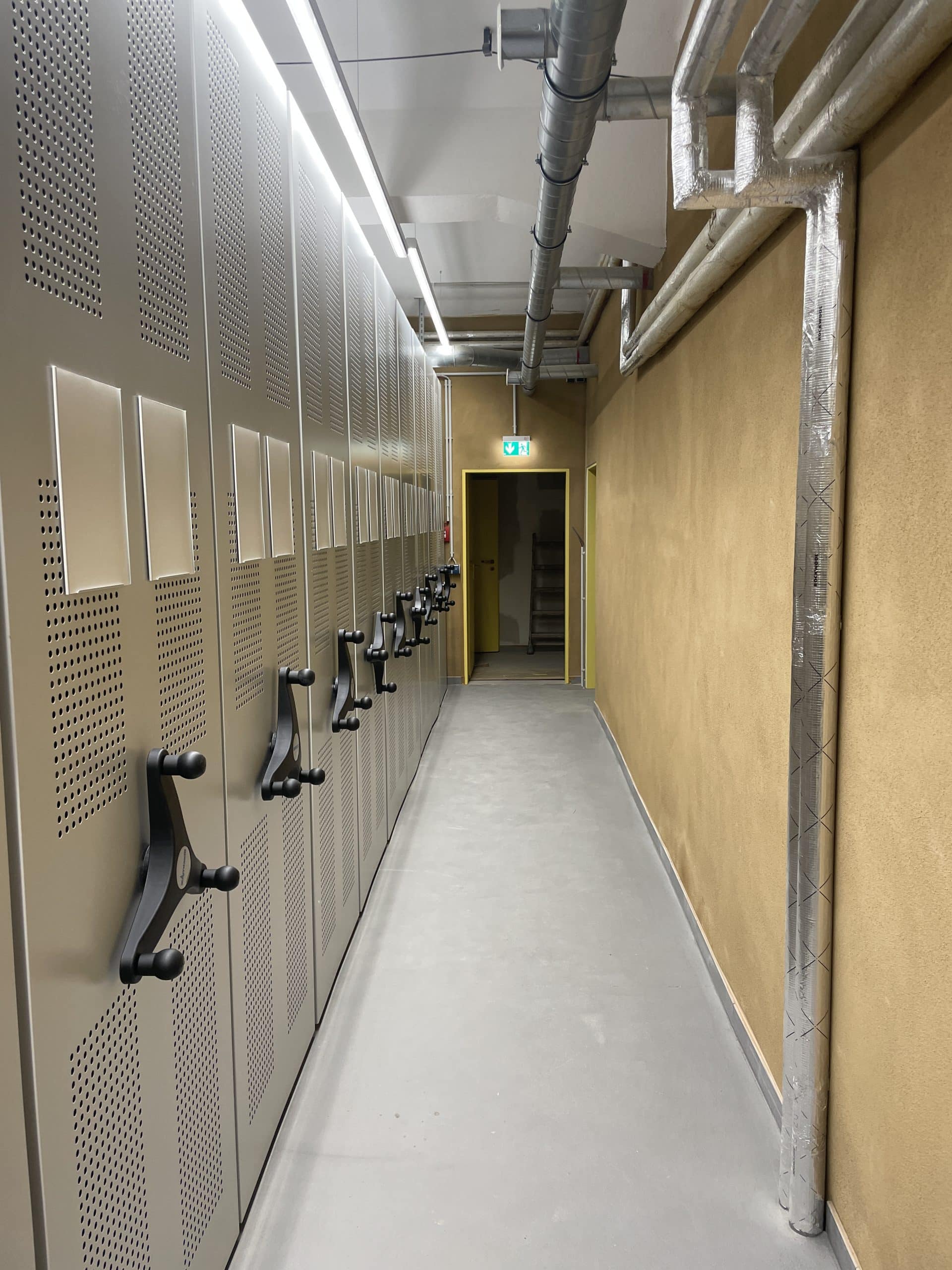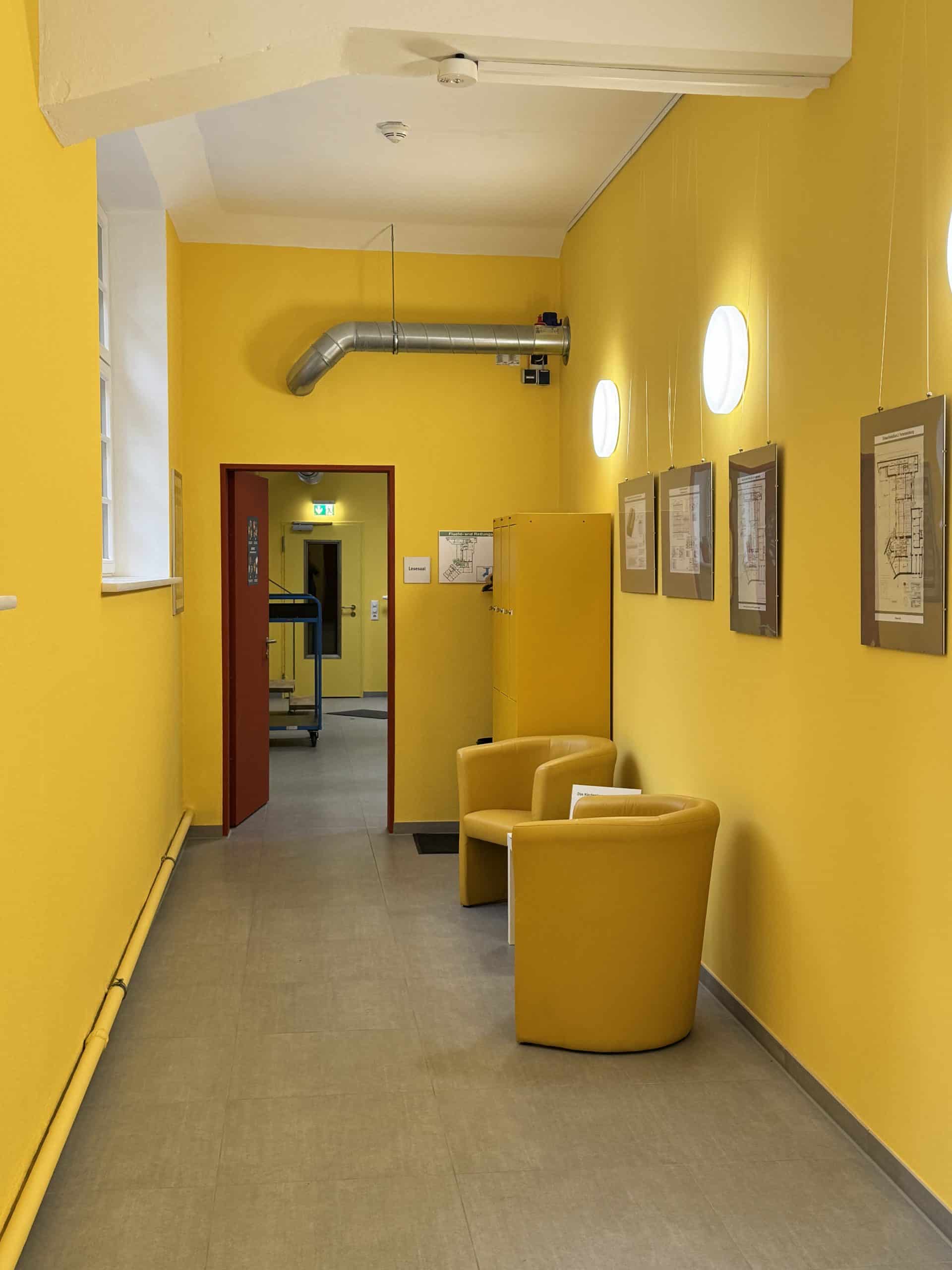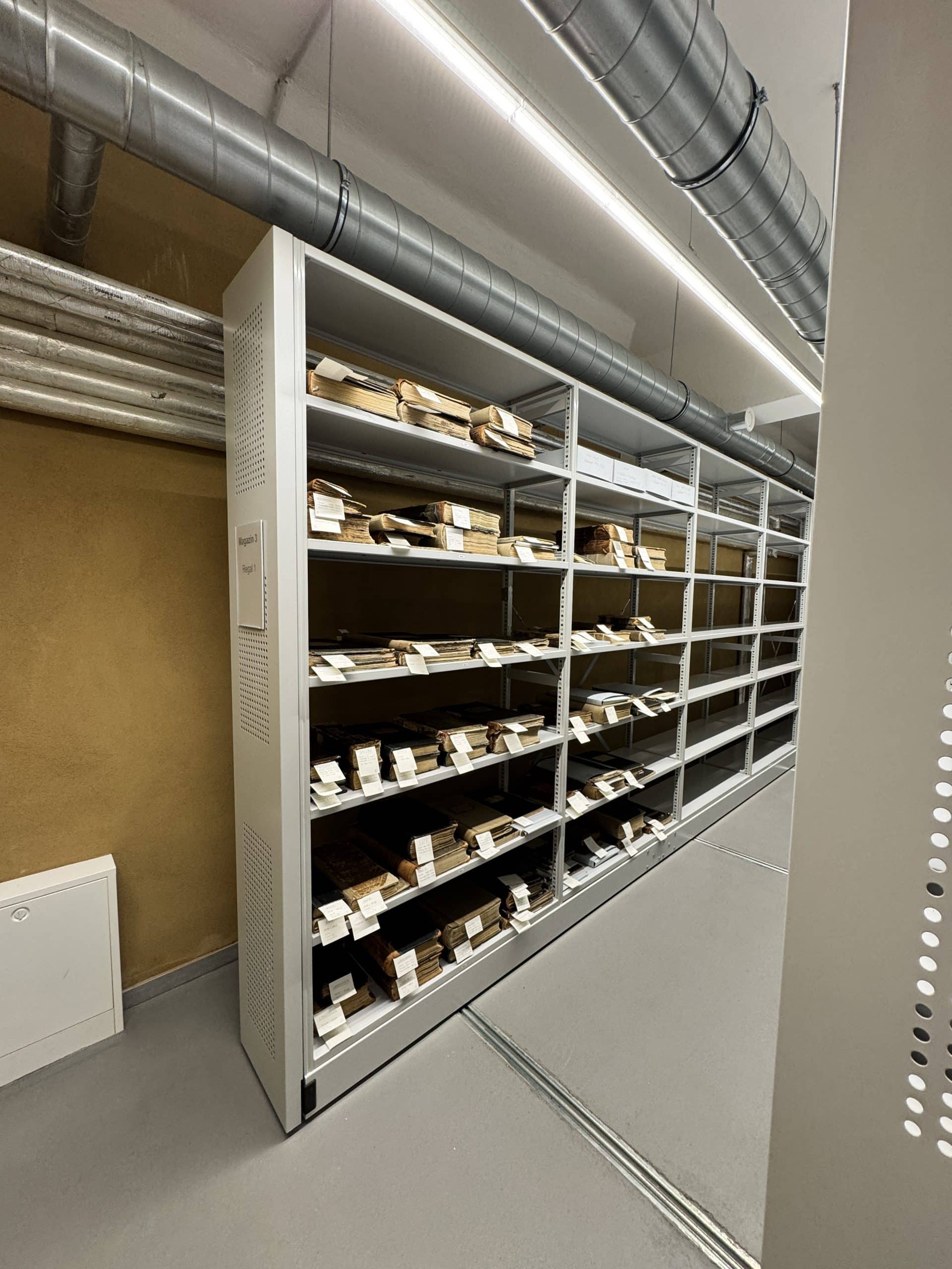 So entstanden nach umfangreichen Baumaßnahmen drei große Magazinräume mit Archivregalanlagen, ein Lesesaal und rückwärtige Räume zur Zwischenlagerung, Sichtung und Aufarbeitung des Archivmaterials sowie eine Teeküche sowie mehrere WC, die teilweise auch für Gemeindeveranstaltungen genutzt werden können. Viel Mühe wurde in die Klimatisierung gesteckt, es gibt Holzfaserdämmung, Wandheizungen, Lehmputze zum Feuchteausgleich, eine Lüftungsanlage mit Wärmepumpe …als Voraussetzung wurde das ganze Souterrain sorgfältig abgedichtet. Natürlich spielte auch der Einbruchs- und Brandschutz eine große Rolle. Das Archiv wird nun durch einen rückwärtig angebauten Fahrstuhl in gläsernem Schacht barrierefrei erschlossen, und die Gemeinde entschloss sich, auch die Gemeinderäume im Obergeschoss an den Fahrstuhl anzuschließen. Verbunden mit der Umgestaltung des Souterrains wurde das Treppenhaus denkmalgerecht in einem warmen Gelbton gestrichen und harmoniert mit dem Ton der Wände der Archivräume.