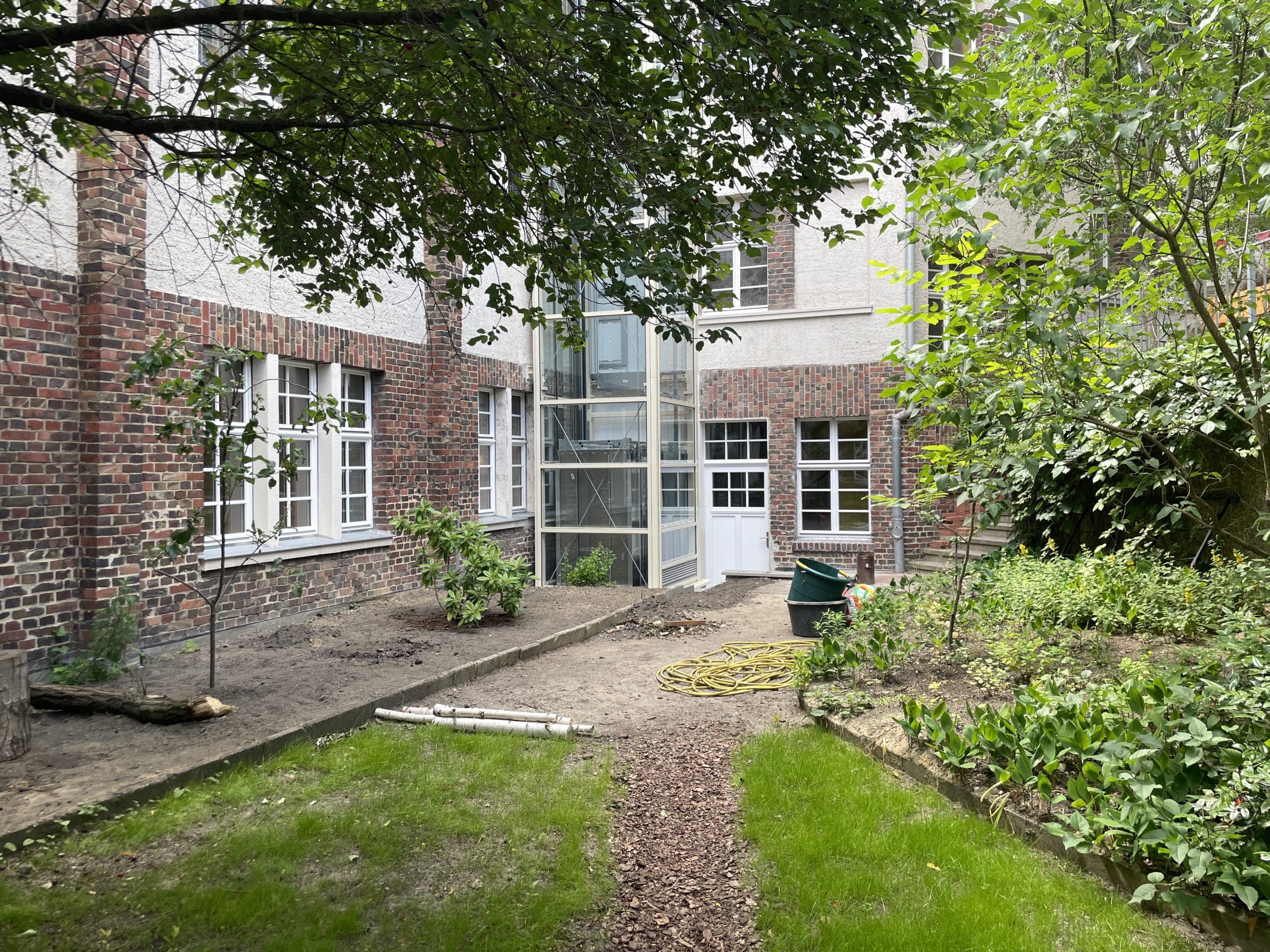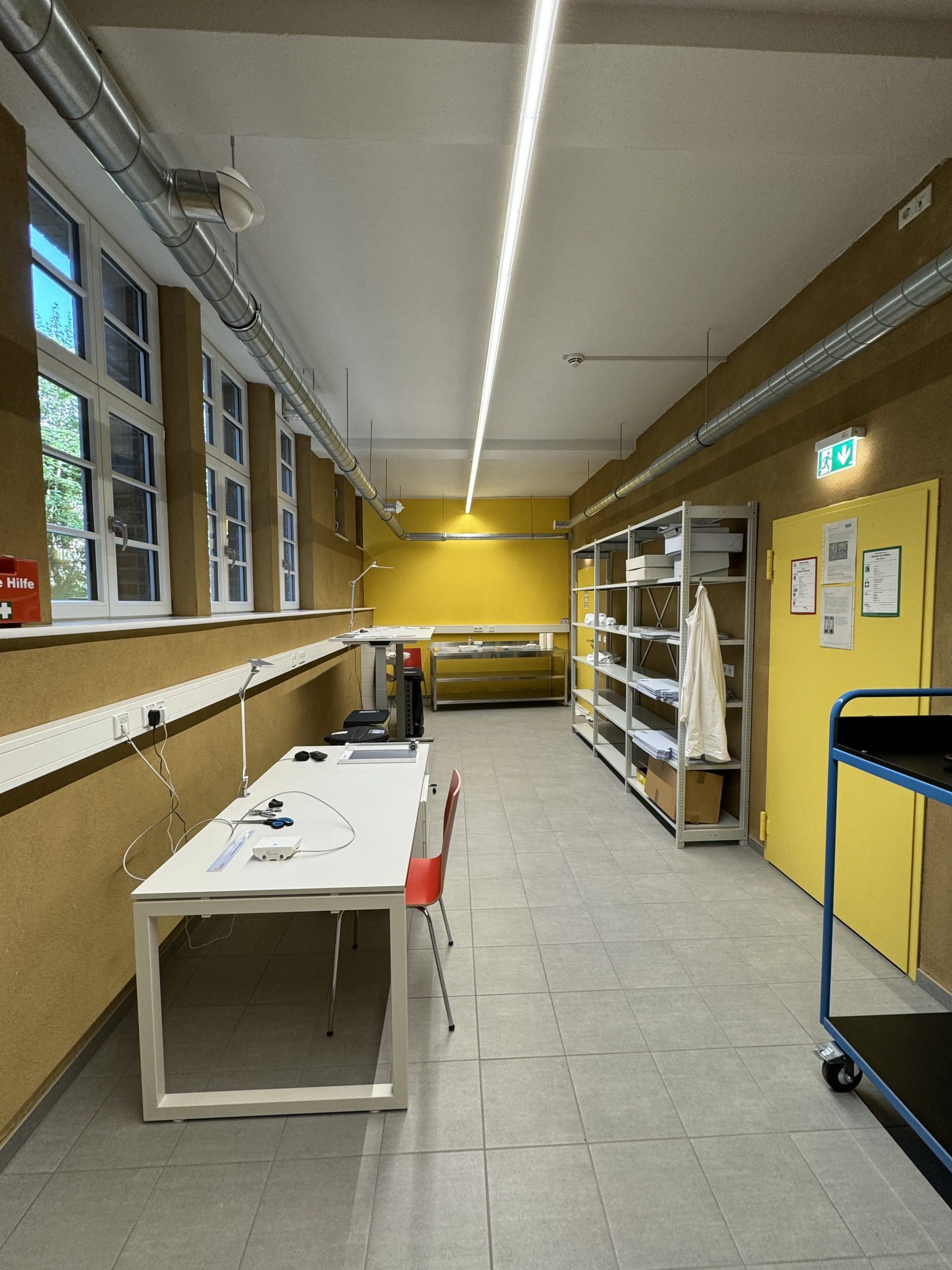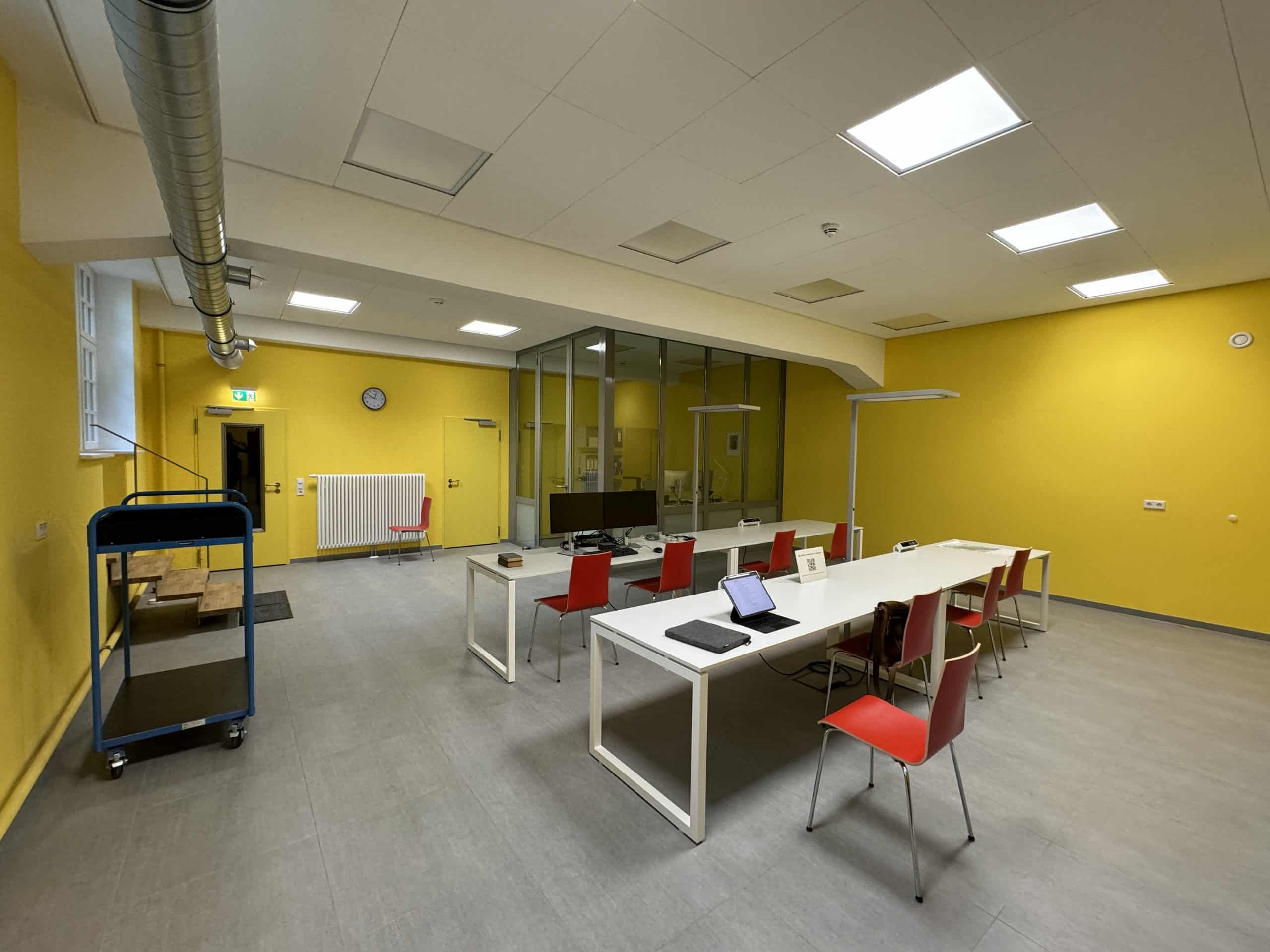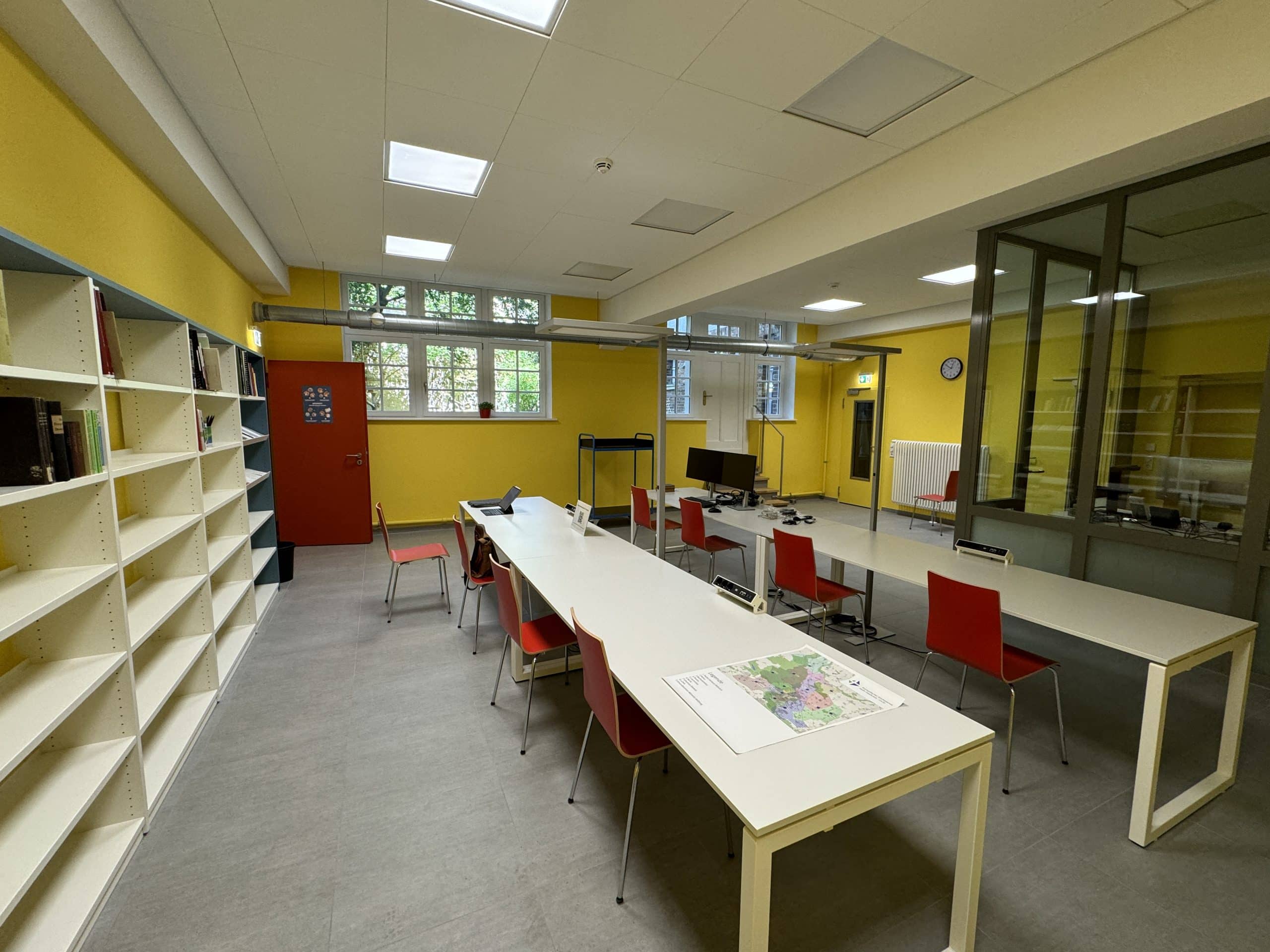 So entstanden nach umfangreichen Baumaßnahmen drei große Magazinräume mit Archivregalanlagen, ein Lesesaal und rückwärtige Räume zur Zwischenlagerung, Sichtung und Aufarbeitung des Archivmaterials sowie eine Teeküche sowie mehrere WC, die teilweise auch für Gemeindeveranstaltungen genutzt werden können. Viel Mühe wurde in die Klimatisierung gesteckt, es gibt Holzfaserdämmung, Wandheizungen, Lehmputze zum Feuchteausgleich, eine Lüftungsanlage mit Wärmepumpe …als Voraussetzung wurde das ganze Souterrain sorgfältig abgedichtet. Natürlich spielte auch der Einbruchs- und Brandschutz eine große Rolle. Das Archiv wird nun durch einen rückwärtig angebauten Fahrstuhl in gläsernem Schacht barrierefrei erschlossen, und die Gemeinde entschloss sich, auch die Gemeinderäume im Obergeschoss an den Fahrstuhl anzuschließen. Verbunden mit der Umgestaltung des Souterrains wurde das Treppenhaus denkmalgerecht in einem warmen Gelbton gestrichen und harmoniert mit dem Ton der Wände der Archivräume.
