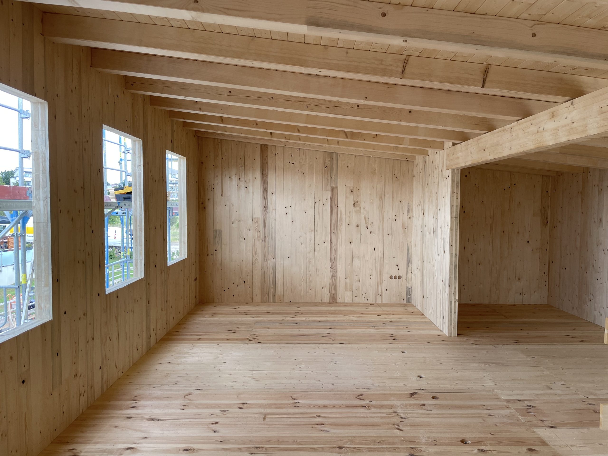 Dieses Wohnhaus aus Brettsperrholz wird derzeit aufgebaut. Der Rohbau wurde nach einer computergesteuerten Vorfertigung im Werk innerhalb von fünf Tagen aufgebaut. Dem vorangegangen ist eine intensive Planungsphase, in der alle Details festgelegt wurden. Der Bauherr konnte sich jederzeit zu Hause den Planungsstand im dreidimensionalen Computermodell anschauen, durch sein Haus wie in einem Computerspiel durchlaufen. So wurden beispielsweise die Steckdosen eingeplant, die im Werk an Ort und Stelle präzise vorgebohrt worden sind.