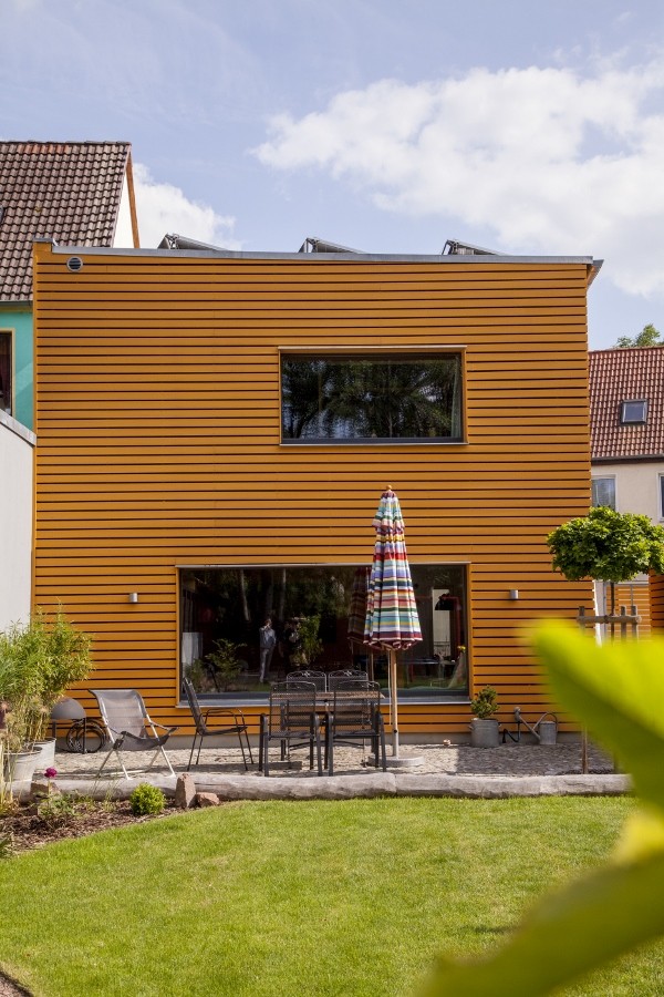 Das Passivhaus wurde an eine bestehende Häuserreihe angebaut. Da die Straßenseite im Süden liegt und sich die Wohnräume zum Garten orientieren sollten, wurde im Obergeschoss ein großes Treppenhausfenster angeordnet, um die Südsonne einzufangen. Das Gebäude verjüngt sich mit dem Grundstück zum Garten hin, Wohnküche im Erdgeschoss und Kinder- und Schlafzimmerzimmer im Obergeschoss orientieren sich mit bodentiefen Fenstern nach Westen. Dort wurde mit der Garage im Norden, einem überdachten Durchgang zum Garten und einer Mauer zur Straße ein geschützter Wohnhof geschaffen, über den man das Gebäude betritt. Große Fenster gewähren den Blick vom Schlafzimmer bzw. vom Wohnzimmer auf den Garten und in die Landschaft, im Erdgeschoss wurden die Fensterbretter der tiefen Leibungen als Sitzplätze gestaltet. Technikraum und WC im Erdgeschoss sowie Flur im Obergeschoss liegen auf der fensterlosen Ostseite (zum Nachbarhaus hin), wobei der Flur durch ein schmales Aussichtsfenster zur Straße belichtet wird.